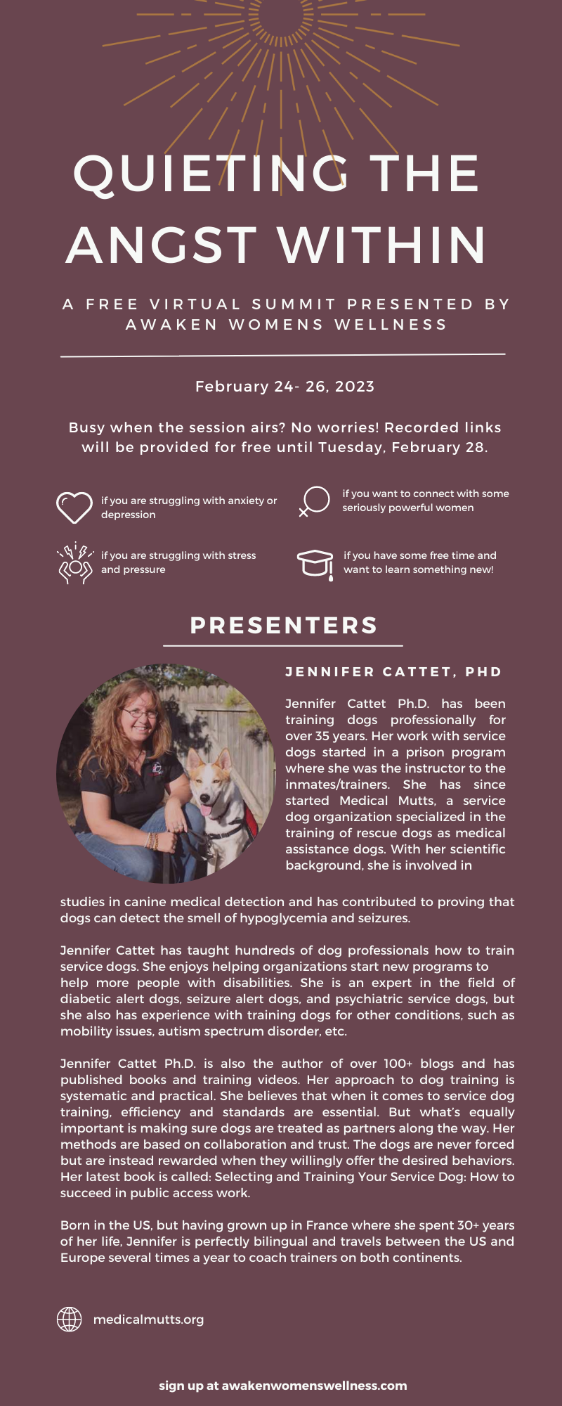 IF YOU ARE STRUGGLING WITH STRESS, ANXIETY, OR DEPRESSION, SIGN UP TODAY AND LEARN TOOLS YOU CAN USE TO QUIET THE ANGST WITHIN. PRESENTERS ARE HIGHLIGHTED BELOW. RECORDED LINKS WILL BE PROVIDED FOR FREE UNTIL TUESDAY, FEBRUARY 28.